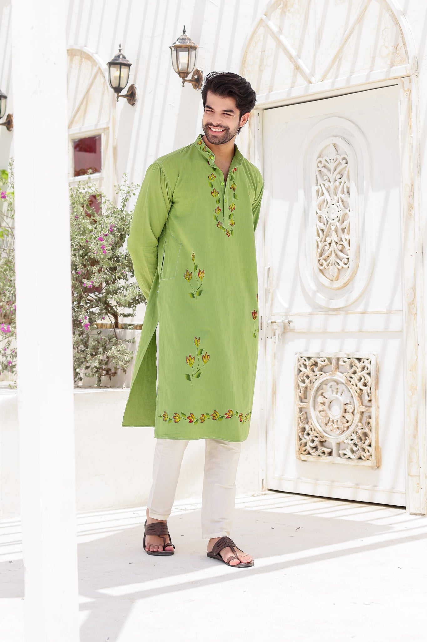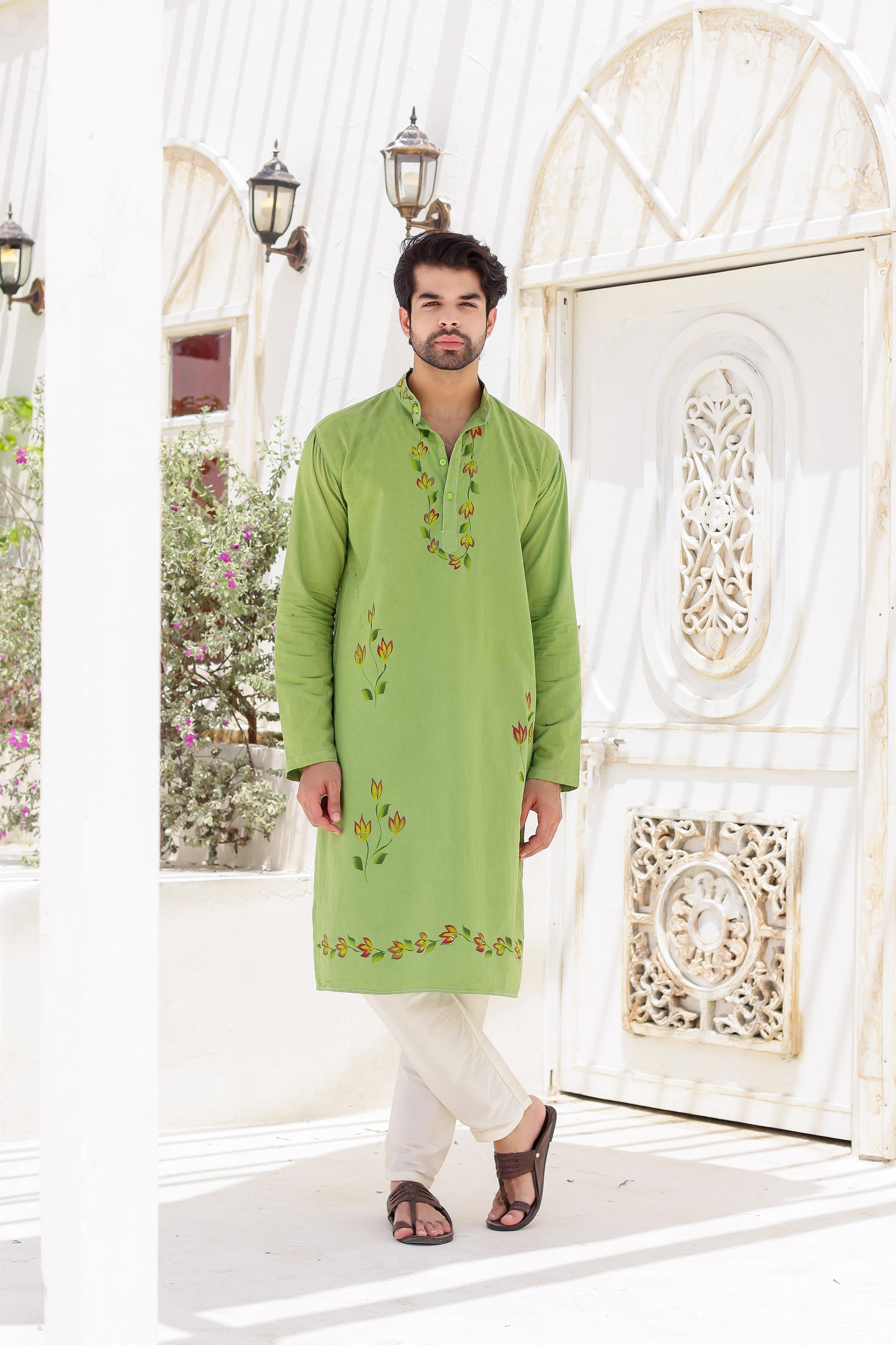 Kurtas hand painted with organic colors on pure fabrics.Garden Breeze Kurta (Handpainted Green Pure Cotton Kurta)