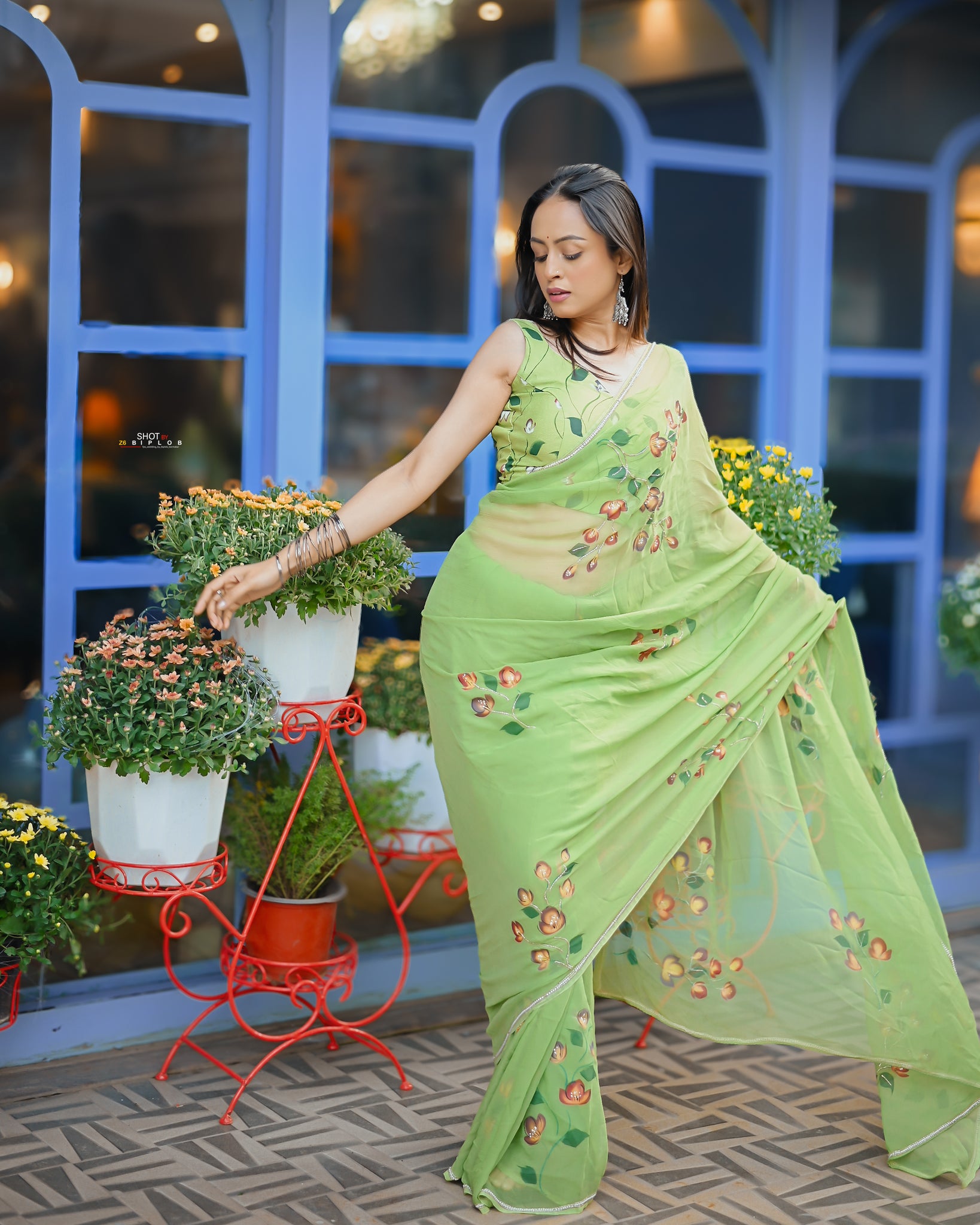 A soft pistachio green chiffon saree, brought to life with delicate handpainted floral motifs.