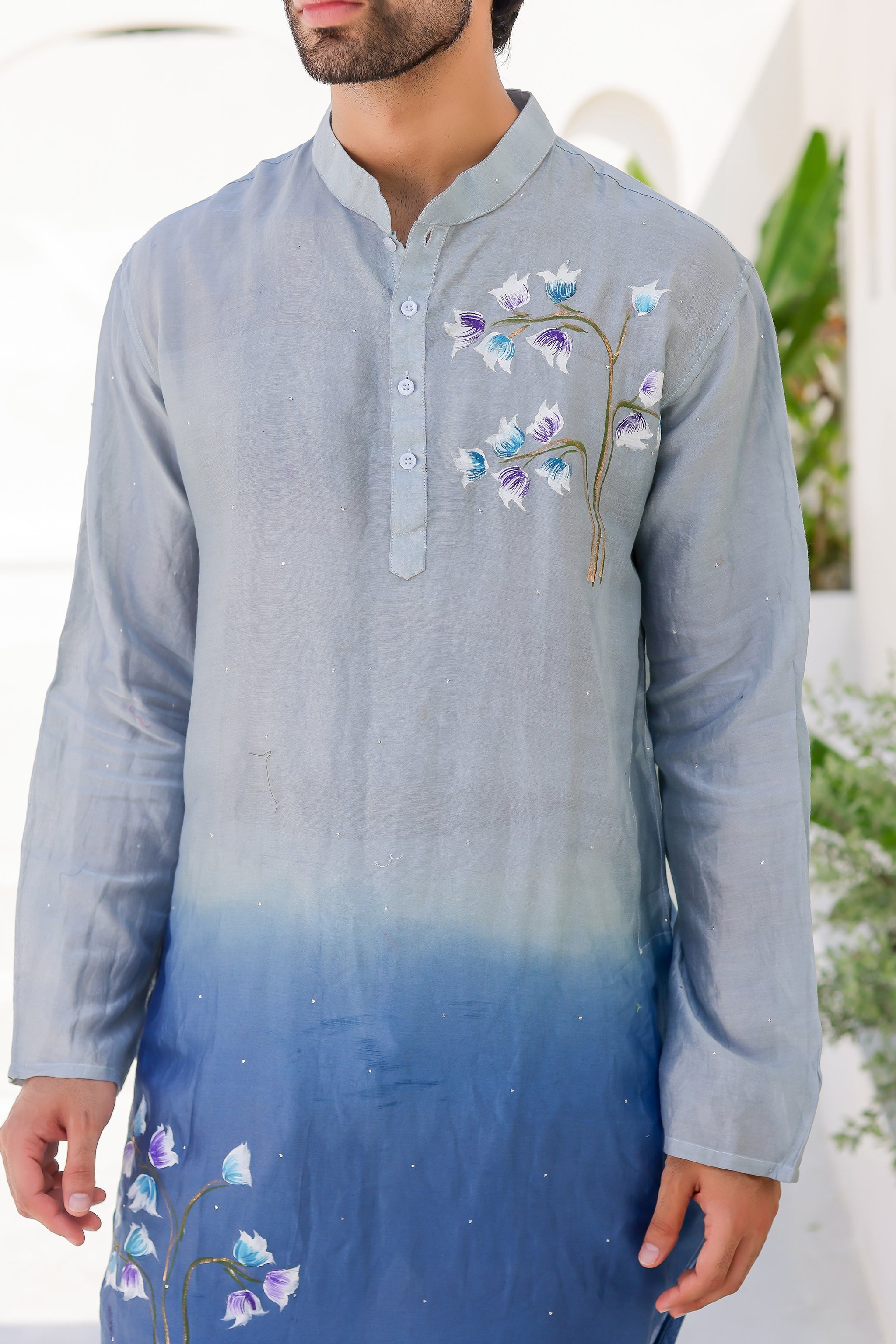 Like the meeting of sky and ocean at dawn, the Blue Horizon Kurta flows with graceful ombre hues and handpainted blooms. A kurta crafted for the modern man who embraces art in everyday elegance.”